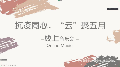 为进一步丰富员工的校园文化生活,在全面落实防疫政策的基础上,388vip太阳集团官网员工会于5月1日利用腾讯会议举办“抗疫同心,云聚五月”线上音乐会,旨在用歌声凝聚管法力量,帮助员工缓解疫情生活中的疲惫与不安。音乐会伊始,精彩的节目、悠扬悦耳的歌声将线上音乐会推向了高潮。在音乐会中,进行了多轮互动环节,抽取幸运观众给予惊喜小礼品,带动了直播间的氛围。疫情于此,抗疫同心,线上音乐会圆满举行,体现了管法学子积极乐观的心态,展现了管法学子的青春风采。